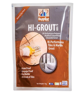 Happilac Hi-Grout G-100 is a premixed cementitious powder formulated as a high-performance water-resistant dry set fixing mortar for ceramic wall tiles, floor tiles, swimming pool tiles, marble, and terrazzo tiles. It is intended for both porous and non-porous ceramic tiles. It can be used on concrete lightweight brick, block, and plasterboard on interior and exterior surfaces. HI-Grout G- 100 can also be used on surfaces plastered with water-resistant plasters or base WR on damp concrete interiors. HI-Grout G-100 is made especially for grout lines smaller than 1/8 inch wide.